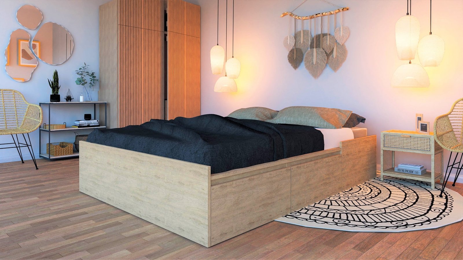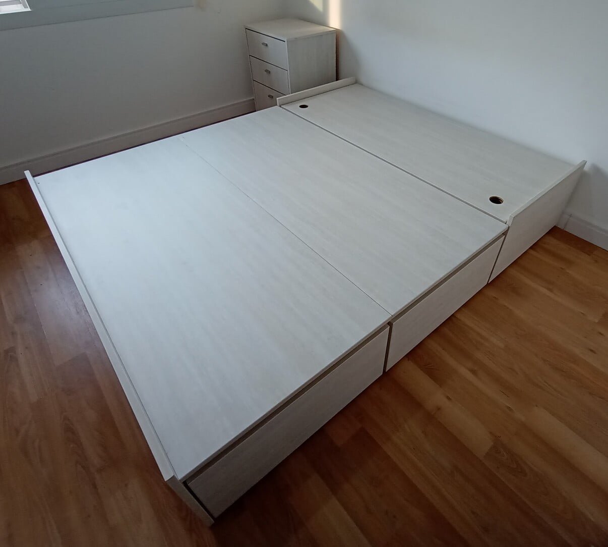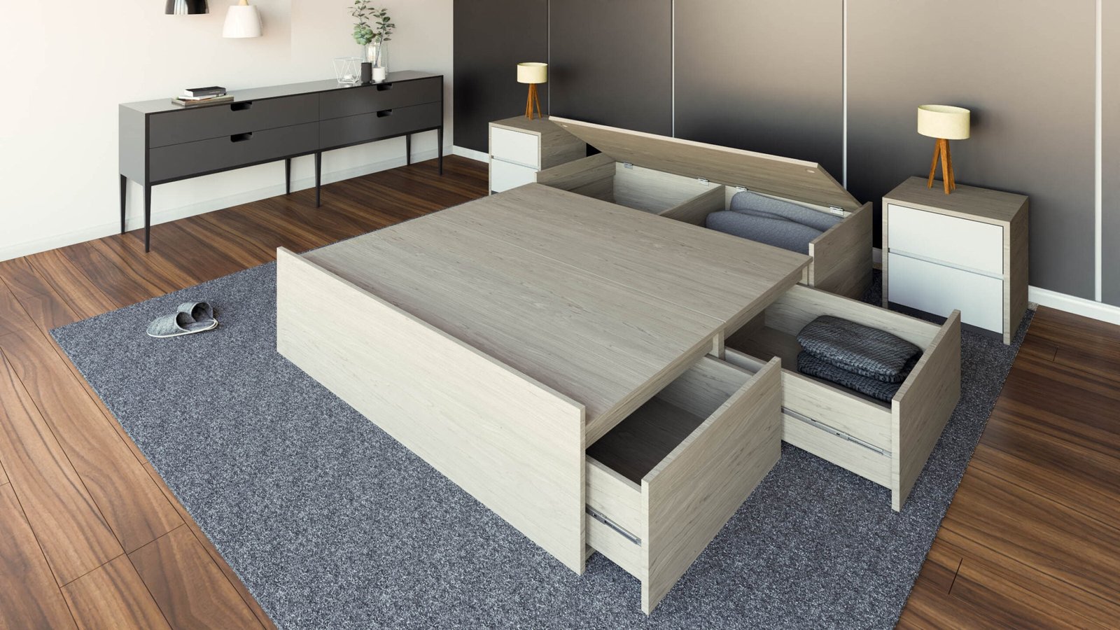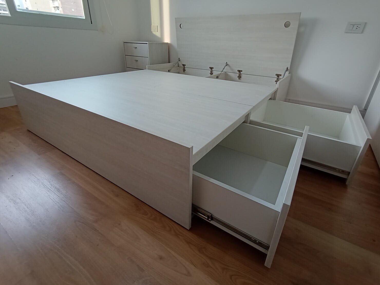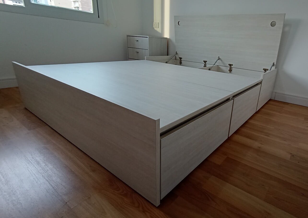 La Baulera en la cabecera tiene tapa amortiguada con Pistones a Gas, es ideal para guardar objetos voluminosos y ropa de cama de uso poco frecuente.